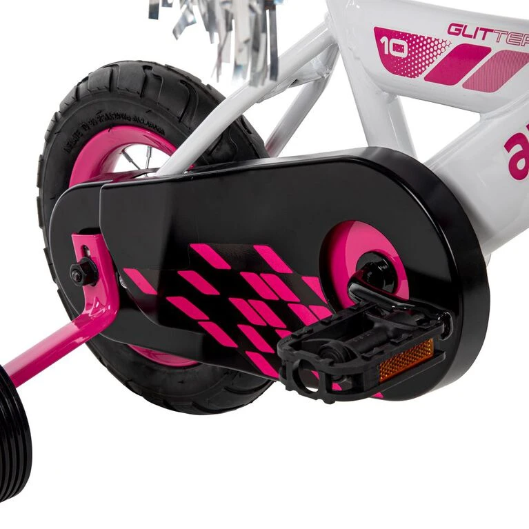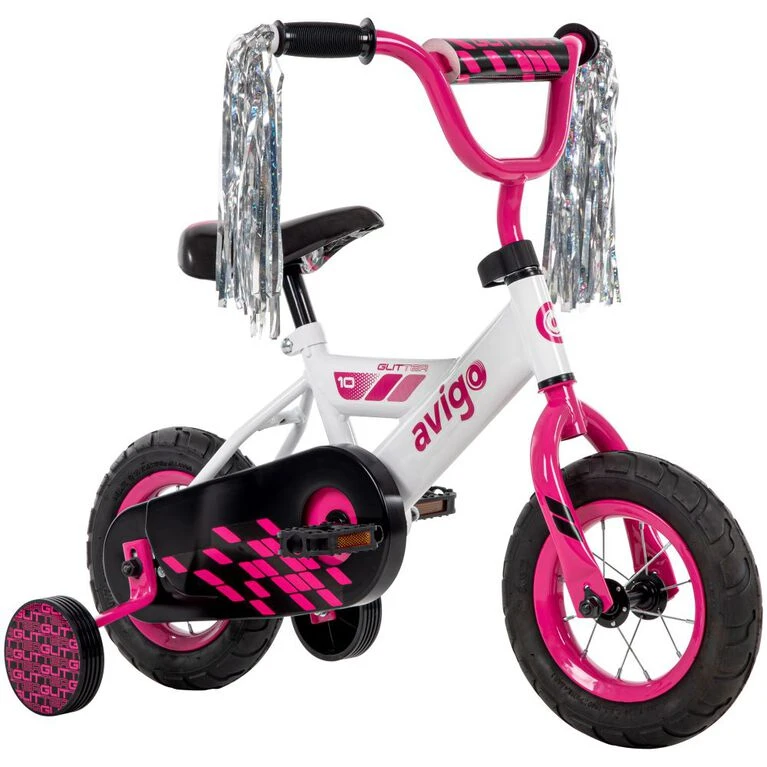 This Avigo 10-inch bike is great for your little girl who loves daring adventure! Complete with training wheels, junior-sized pedals, and a fully enclosed chainguard, the Avigo Glitter is great for your new rider. The adorable pink graphics on this black and white bike will make your rider excited for every ride ahead. The padded seat and soft mushroom handlebar grips keep your child comfortable as they ride, and the easy-to-use coaster brake gives them great control as they ride. Your child will be glittering with glee as they ride this Avigo 10″ bike for girls!