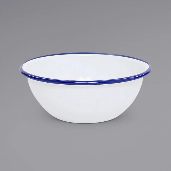 Crow Canyon Home V17BLU Vintage 20 Oz. White Round Enamelware Bowl With Blue Rolled Rim