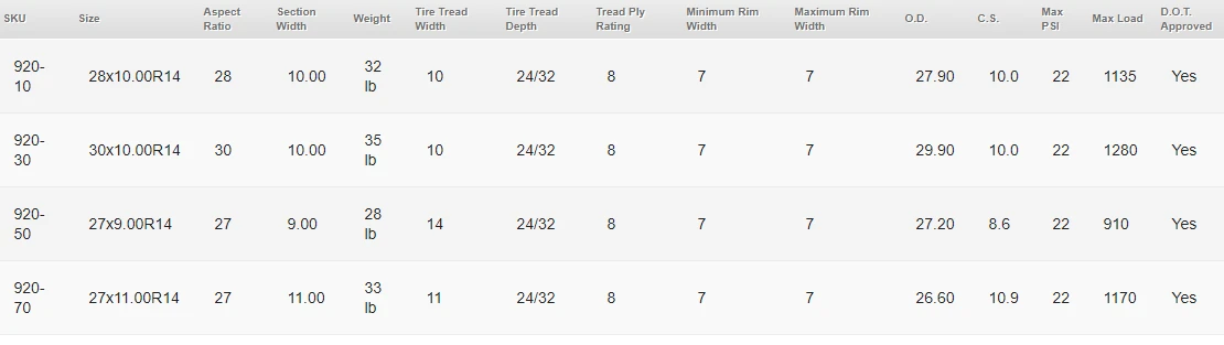 | 920-50 | 27×9.00R14 | 28 lb | 24/32 | 8 | 7″ | 22 | 910 | Yes |