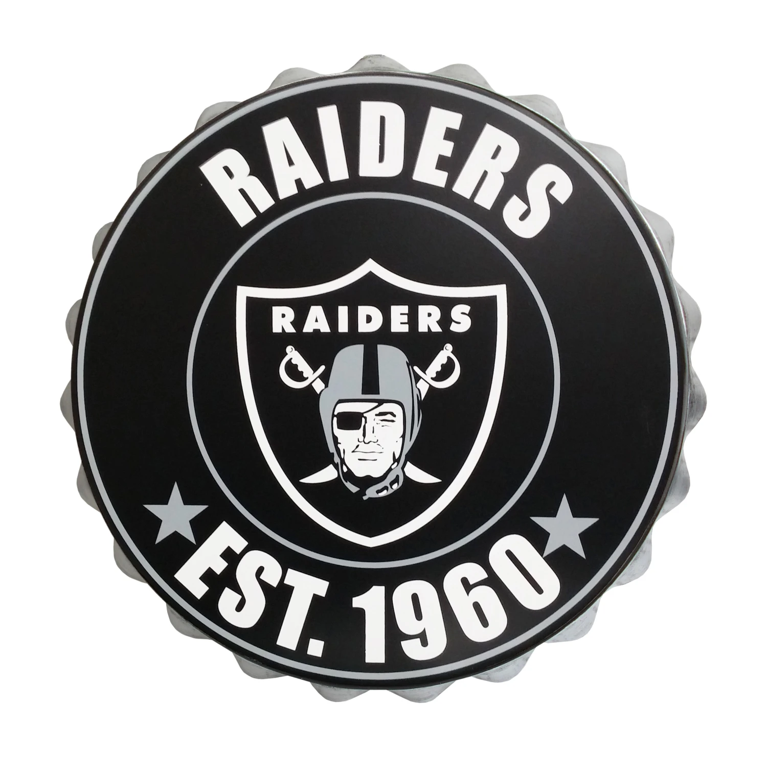 This Bottle Cap Wall Logo from Forever Collectibles is a large metal bottle cap replica with Oakland Raiders team logo printed on top to add vintage flair to any room. Measures 13″ in diameter.