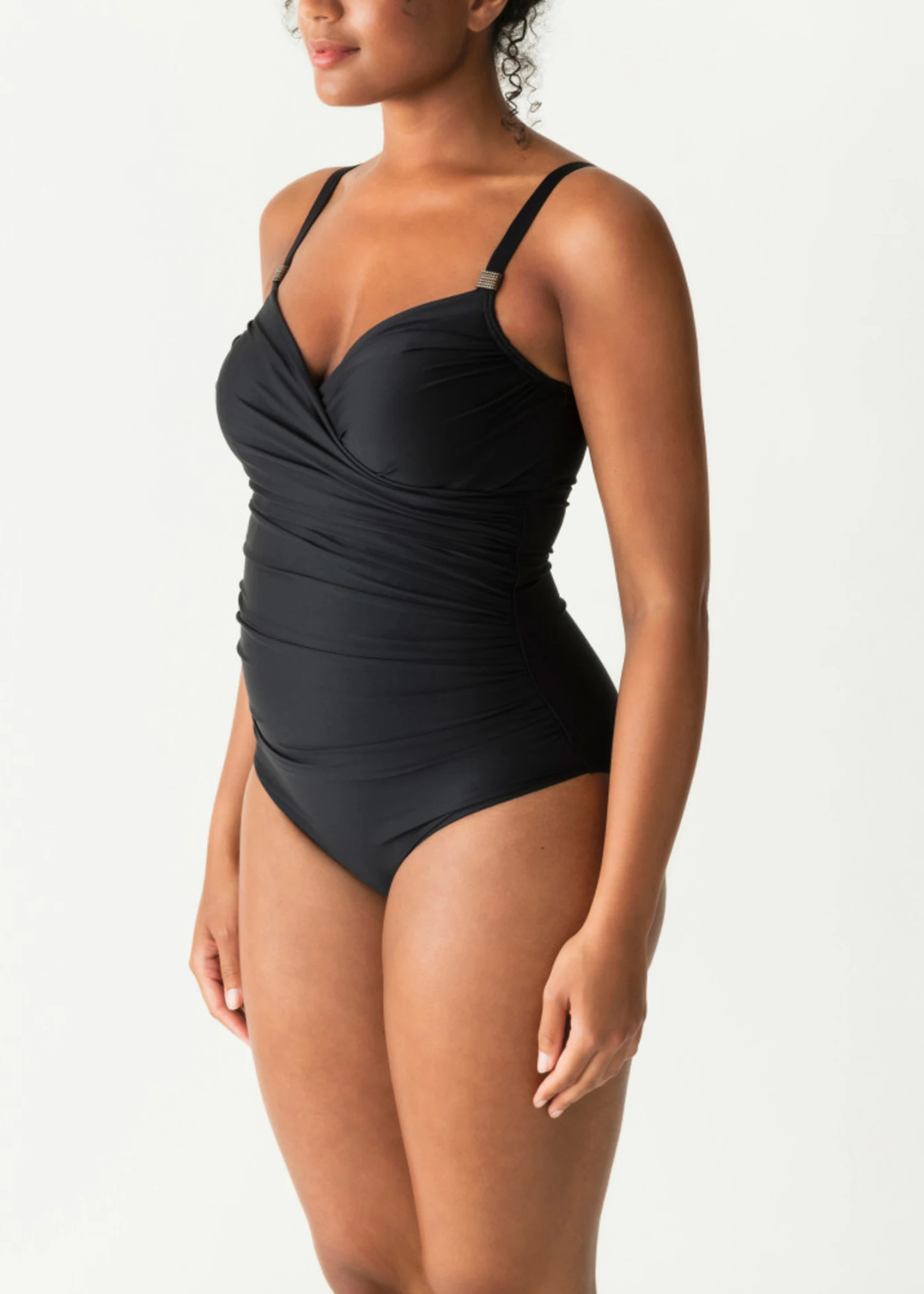 Body-slimming swimsuit with integrated underwire bra and elegant asymmetrical draping in front. The adjustable shoulder straps can be worn around the neck using the special halter fastening or by tying them in a knot. This is a first for a swimsuit! Booboo Blue is a warm blue-green with 60’s allure.